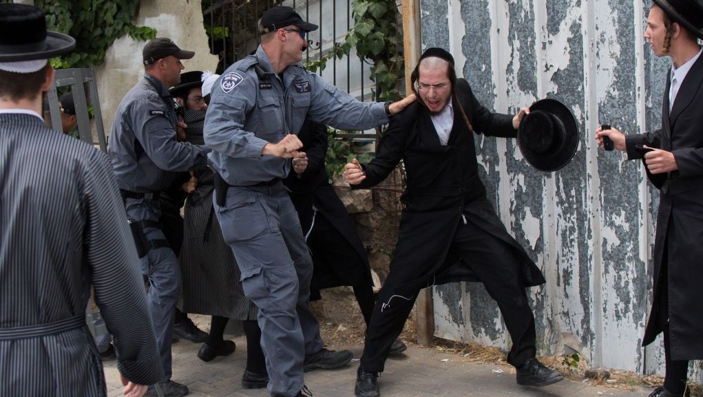 zdjęcie izraelskich policjantów walczących z ultraortodoksyjnymi demonstrantami w Jerozolimie 10 sierpnia 2014 r. Protest odbył się przeciwko profanacji starożytnych grobów odkrytych na budowie nowego osiedla mieszkaniowego w pobliżu Bramy Damasceńskiej/Photo credit: Yonatan Sindel/Flash90/