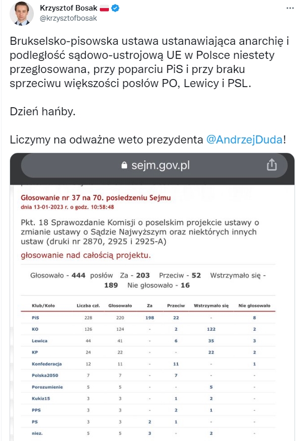 Chodzi o suwerenność prawną III RP. To historyczny dzień dla targowicy. KO (PO) umyło ręce jak Piłat wstrzymując się od głosu. Długo oczekiwane srebrniki mają dotrzeć do Polski po wejściu w życie ustawy dzięki której podległość sądowo-ustrojowa wobec Berlina i Brukseli stanie się faktem. Jest to kolejne ustępstwo w długim ciągu upokarzających aktów prawnych i politycznych degradujących Polskę do roli bantustanu.