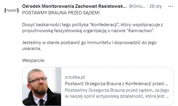 „Prezes Zarządu Fundacji Ośrodek Monitorowania Zachowań Rasistowskich i Ksenofobicznych występuje w sprawie PO II Ds.5.2016 w charakterze podejrzanego.