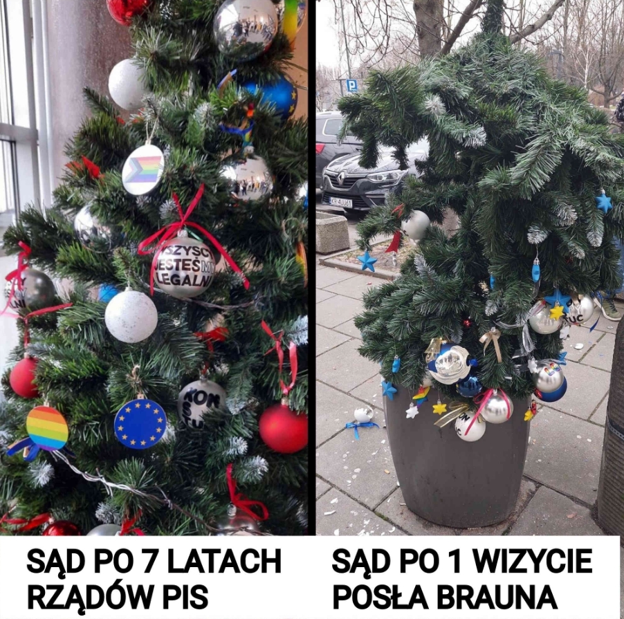 Poseł Grzegorz Braun reprezentujący w Sejmie III RP polską mniejszość narodową wyrzucił do śmietnika symbol unijnej praworządności – choinkę udekorowaną m.in. ozdobami Lgbt (-)