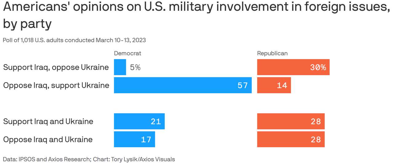 „Czterech na pięciu Republikanów chce, aby Stany Zjednoczone pozostały wiodącą potęgą na świecie – ale mniej niż połowa popiera przekazywanie Ukrainie broni i wsparcia finansowego, aby próbowała ratować się przed Rosją, zgodnie z ostatnią falą w indeksie Axios-Ipsos Two Americas”