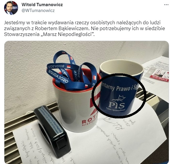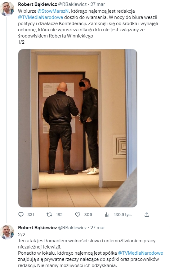 Wprost/Nocne wejście do siedziby Stowarzyszenia Marsz Niepodległości. „Mamy podejrzenia”. “Mamy podejrzenia, że wykorzystywany do nowej telewizji sprzęt jest tym samym sprzętem, który był wykorzystywany przez Media Narodowe – skomentował w rozmowie Onetem Witold Tumanowicz, jeden z inicjatorów akcji”