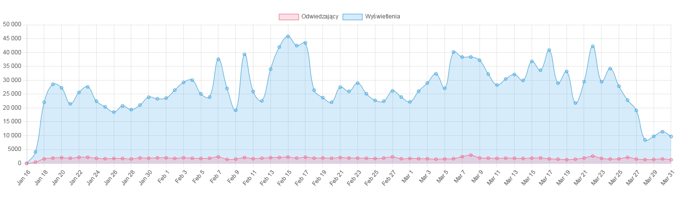 Statystyki z Webalizera (analizator logów serwera http) nie pokazują żadnych skokowych zmian po 27.02, zatem obraz pokazywany przez wtyczkę Statistics dla WordPress mógł być zafałszowany na skutek interakcji z pamięcią podręczną (cache), którą włączyłem właśnie 27.03. Redakcja postanowiła na razie zrezygnować z cache.