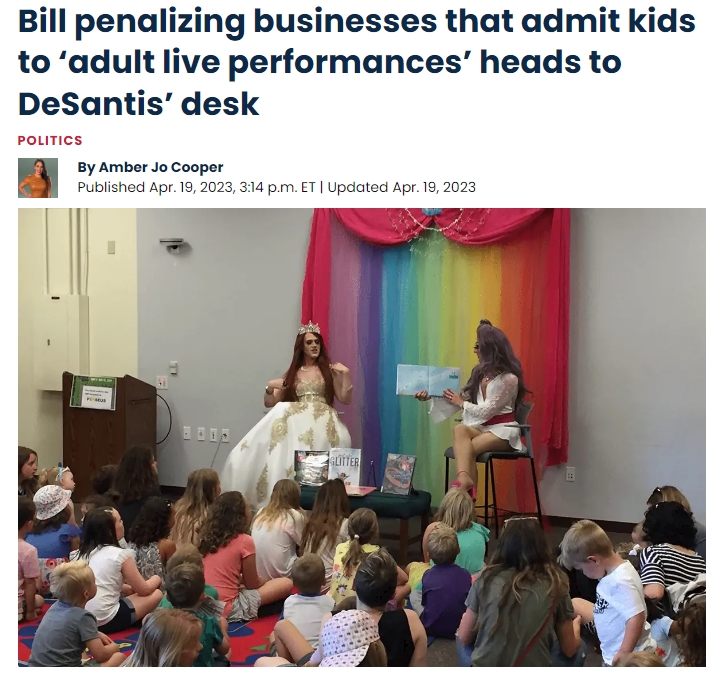 …upoważniałoby Florydę do nakładania grzywien, zawieszania lub cofania licencji każdej instytucji publicznej, która dopuszcza dziecko do „występów na żywo dla dorosłych”, które przedstawiają lub symulują nagość, zachowania seksualne lub lubieżne ekspozycje.