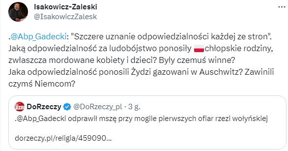 Kolejnej absurdalnej wypowiedzi dopuścił się Abp Gądecki, który podczas odprawionej Mszy św. w Parośli na Ukrainie, miejscu męczeństwa Polaków powiedział o “Szczerym uznaniu odpowiedzialności każdej ze stron – lub przynajmniej gotowość do jej szukania”