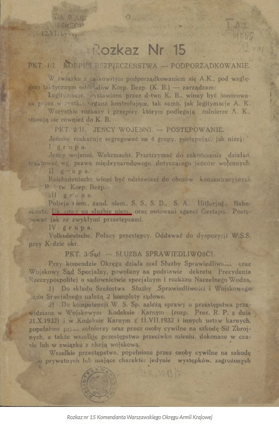 Rozkaz nr 15 Komendanta Warszawskiego Okręgu Armii Krajowej z dnia 12 sierpnia 1944 dotyczący “Ukraińców na służbie niemieckiej”.