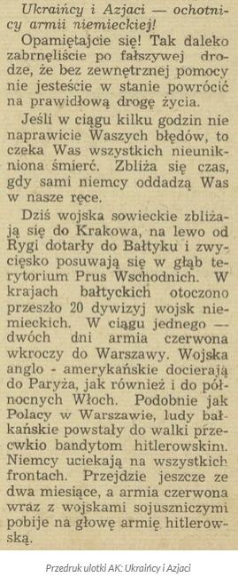 Przez dziesiątki lat Polacy obchodzili rocznicę Powstania Warszawskiego nie wyliczając narodowości, które mordowały razem z Niemcami ludność cywilną. Z przekazów ocalałych z rzezi wiadomym było, że najgorsi byli “Ukraińcy” oraz “Azjaci”. 11 sierpnia Armia Krajowa wydała ulotkę Ukraińcy i Azjaci – ochotnicy niemieckiej armii, która została przedrukowana 23 sierpnia przez Warszawski Głos Narodowy (w pierwszej kolumnie od prawej strony)