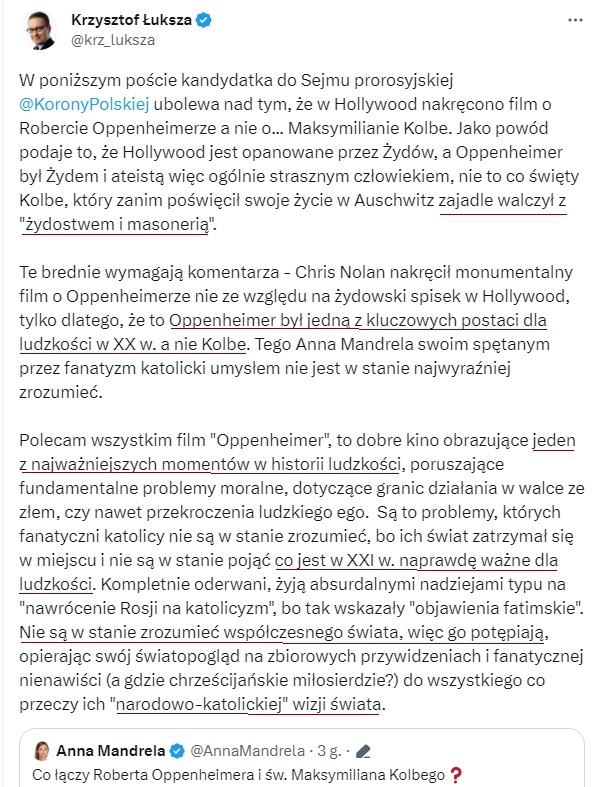 3. …zajadle walczył z “żydostwem i masonerią”… A co w tym złego? Skłamałbym, gdybym napisał, że pierwszy raz słyszę, że jest to “coś złego”. Być może Krzysztof Łuksza nie wie w jaki sposób św. Maksymilian walczył z “żydostwem i masonerią”, a walczył jako katolicki kapłan w duchu chrześcijańskim, a to przecież wcale nie oznacza, aby milczeć lub nie pisać prawdy.