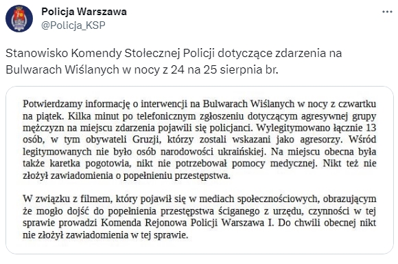 „Policja” pod zarządem PiS wydała komunikat w sprawie napadu na Polaków. Według treści komunikatu wśród wskazanych osobników nie było Ukraińców. Wśród wylegitymowanych byli Gruzini oraz inne osoby o niewymienionej narodowości.