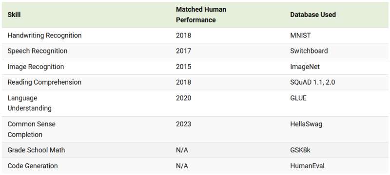 Poniżej znajduje się tabela przedstawiająca moment, w którym sztuczna inteligencja zaczęła dorównywać wydajności człowieka w zakresie wszystkich ośmiu umiejętności: