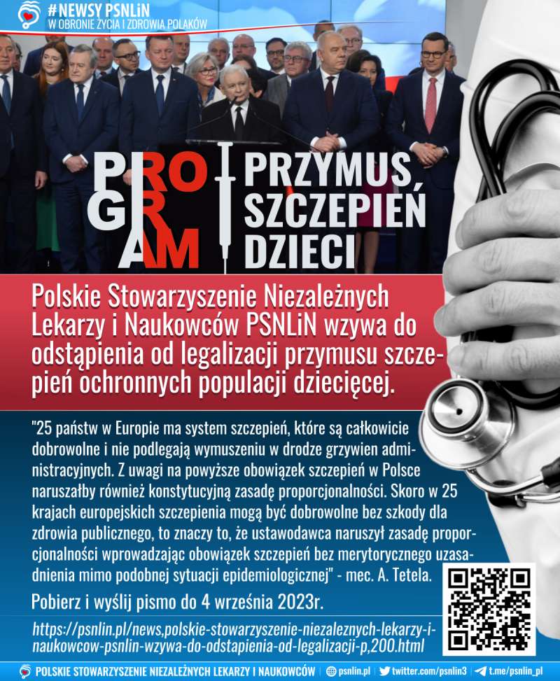 – rozporządzenia, które ma stać się aktem prawa powszechnie obowiązującego, Polskie Stowarzyszenie Niezależnych Lekarzy i Naukowców wzywa władze ustawodawcze w Polsce do nie wyrażania zgody na legalizację przymusu szczepień dzieci! Uzasadnienie swojego stanowiska, przekazaliśmy do Trybunału Konstytucyjnego w maju 2023r.