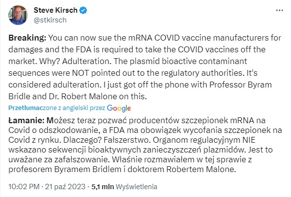 Jak rozumiem, iniekcje nie miały zawierać plazmidu, tylko mRNA. Plazmid był obecny w procesie produkcji i powinien być usunięty przed “zapakowaniem” półsyntetycznego mRNA w lipidowe nanokapsułki. Tak zostało to opisane w zgłoszeniach producenta do certyfikacji, a teraz wychodzi na jaw, że w rzeczywistości materiał w iniekcjach zawierał ok. 30% plazmidów, które albo były zanieczyszczeniem, albo “tajnym składnikiem” (może wprowadzonym w późniejszych partiach szczepionek?) – to już moja interpretacja. Zastanawiam się – może Pfizer doszedł do wniosku, że mRNA ma zbyt krótki czas życia i “przymknął oko” na zanieczyszczenie plazmidem, który wzmacniał i wydłużał działanie preparatu?