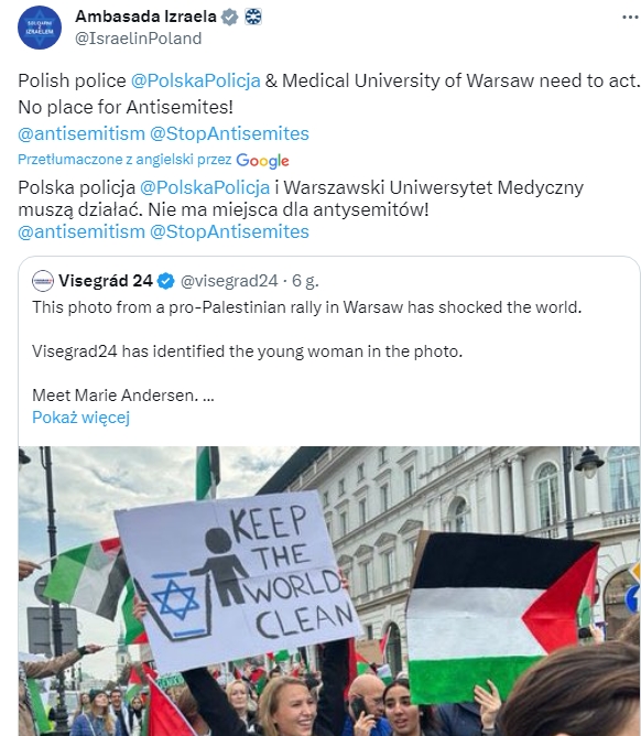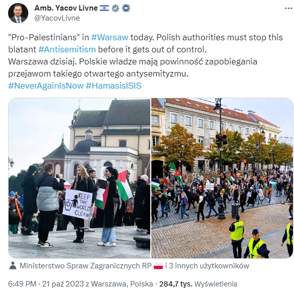 Na demonstrację w Warszawie zareagowała Ambasada Izraela oraz sam Ambasador wzywając do reakcji “polskie władze”