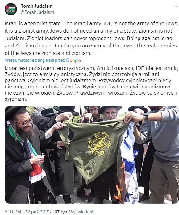 Podobnej argumentacji używają niektóre środowiska żydowskie paląc flagi Izraela oraz potępiając zbrodnie dokonywane na Palestyńczykach