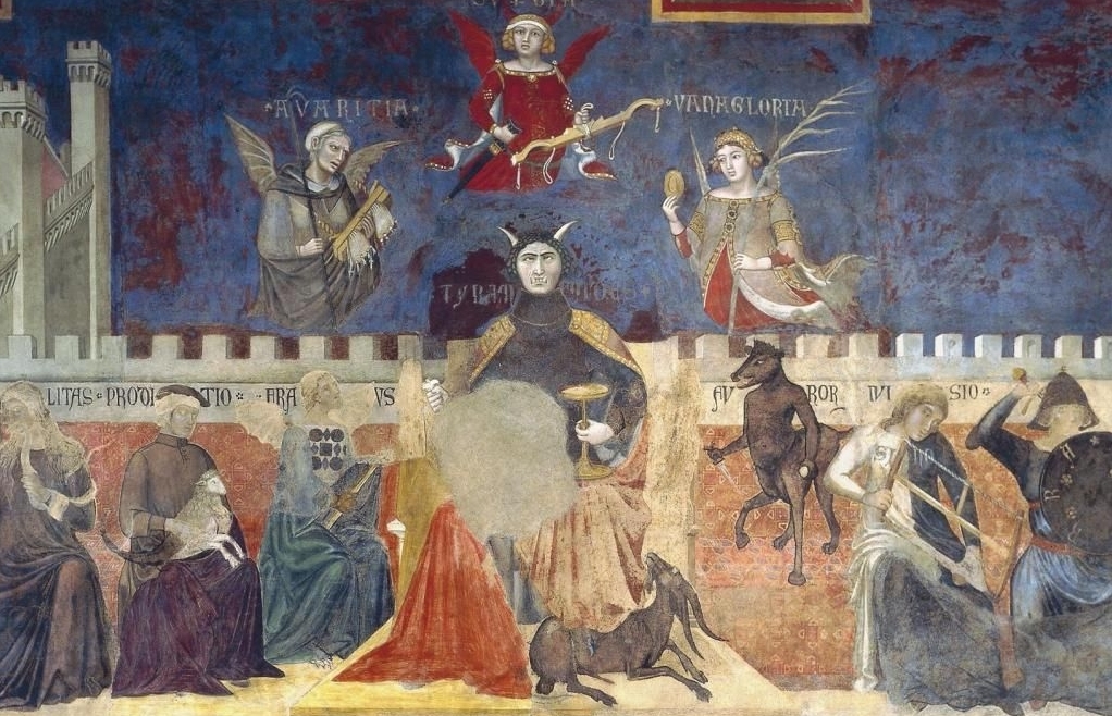 U stop Tyrana znajdziemy kozła, który jest symbolem luksusu, przyjemności cielesnych, żądzy i grzechu. Natomiast źródłem wszelkiego zła są trzy skrzydlate postacie figurujące nad jego głową, opozycja cnót teologicznych – Skąpstwo, Próżność i Pycha. Po prawej i lewej stronie Tyrana ukazują się siedzące rożne aspekty Zła i są to, zaczynając od lewej strony: Okrucieństwo, Zdrada, Oszustwo, Gniew, Niezgoda i Wojna. Personifikacja Okrucieństwa w jednym reku trzyma węza z zamiarem pokazania go noworodkowi. /Alegoria i konsekwencje dobrych i złych rządów…/