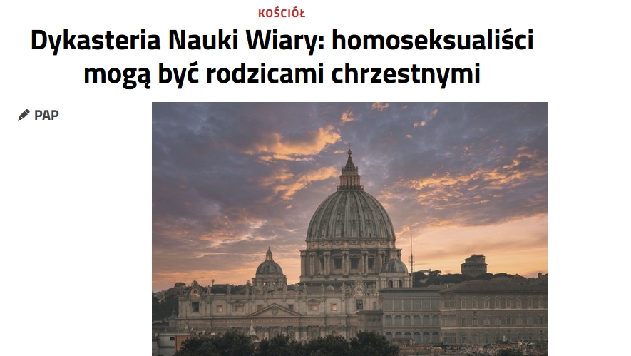 “Osoba transseksualna może otrzymać chrzest i może być też rodzicem chrzestnym i świadkiem na ślubie – oświadczyła watykańska Dykasteria (dawniej kongregacja) Nauki Wiary, odpowiadając na skierowane do niej pytania. Kluczowy urząd Kurii Rzymskiej wyjaśnił, że również homoseksualiści mieszkający z drugą osobą mogą być rodzicami chrzestnymi i świadkami na ślubie”. (Dostęp – 9 listopada 2023)