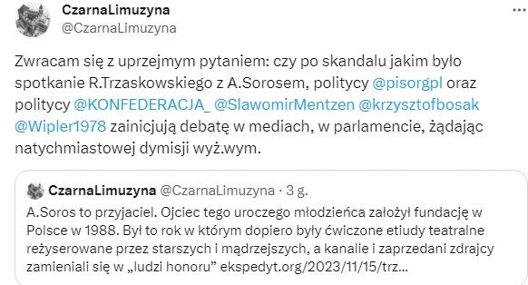Podsumowując: Soros jest po stronie wrogów niepodległej Polski. W takim razie dlaczego nikt nie wzywa do dymisji Trzaskowskiego? Co na to słomiani patrioci z PiS i niezłomni Konfederaci na czele z Mentzenem i Wiplerem?
