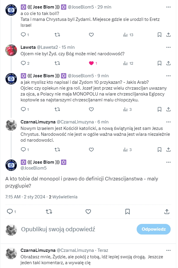 Dziś na Twitterze pod moim wpisem przyplątał się Żyd. Dyskusja toczyła się pomiędzy mną, Polką (Laweta) a wzmiankowanym Żydem, który zaczął nas obrażać. Nie wszystko skopiowałem. Większość wykasował. Musieliśmy go wywalić. To pokazuje typową mentalność potomków ciemności.