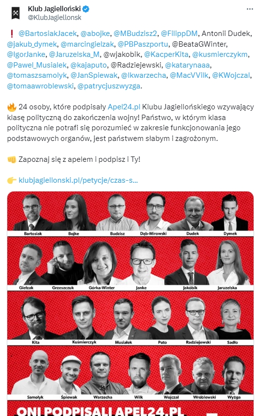 Z inicjatywy Klubu Jagiellońskiego i grupy inicjatywnej wystosowano apel do „polskich polityków”.