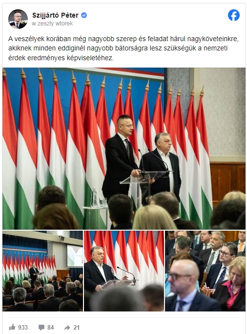 Odzwierciedlając opinie Orbána, minister spraw zagranicznych Péter Szijjártó, który również uczestniczył w spotkaniu, podkreślił na Facebooku zwiększoną rolę i wyzwania stojące przed ambasadorami Węgier. „W erze zagrożeń nasi ambasadorowie będą mieli jeszcze większą rolę i zadania, i będą potrzebowali więcej odwagi niż kiedykolwiek, aby skutecznie reprezentować interesy narodowe” – napisał Szijjártó, podkreślając kluczowe znaczenie dyplomacji w ochronie interesów narodowych Węgier w obliczu globalnej sytuacji niepewności.