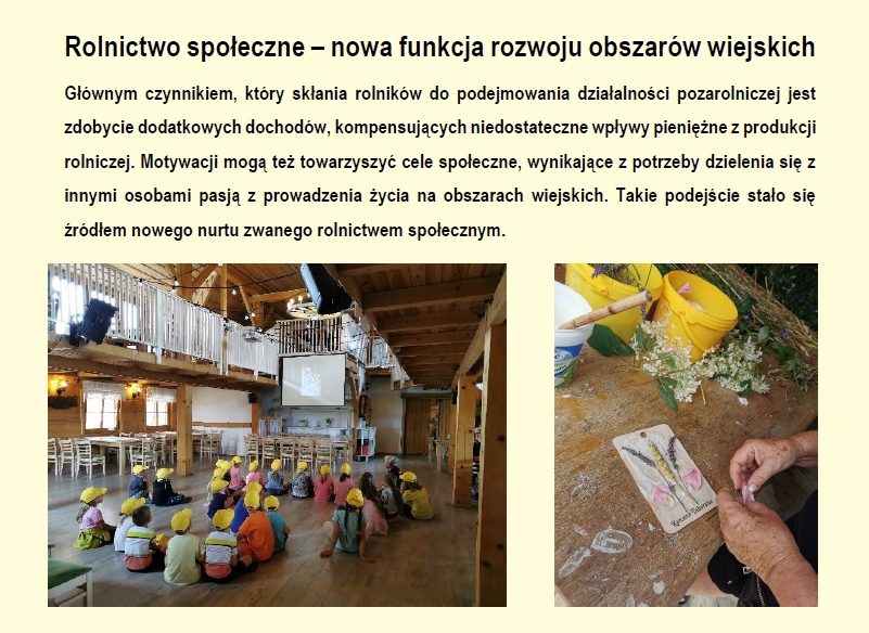 Działania w ramach rolnictwa społecznego mogą obejmować również usługi opiekuńcze dla osób starszych, chorych i samotnych w celu zaspokajania codziennych potrzeb życiowych. Jednak w odróżnieniu do wsparcia z zakresu pomocy społecznej, tego typu usługi rolnik może świadczyć w swoim gospodarstwie rolnym. /Gov.pl/
