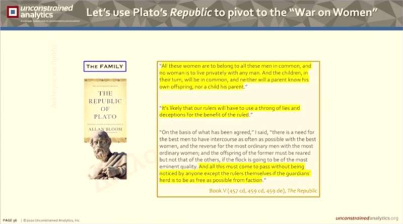 Poniższe zdjęcie to slajd ze streszczenia, cytujący „Republikę” Platona, ukazujący źródło pogardy do kobiet przekazywanej z biegiem czasu przez lewicę. Pogardę tę wyraźnie widać w narzuconej pseudorzeczywistości mężczyzn podających się za kobiety i dopuszczonych do startów w kobiecej lekkoatletyce.