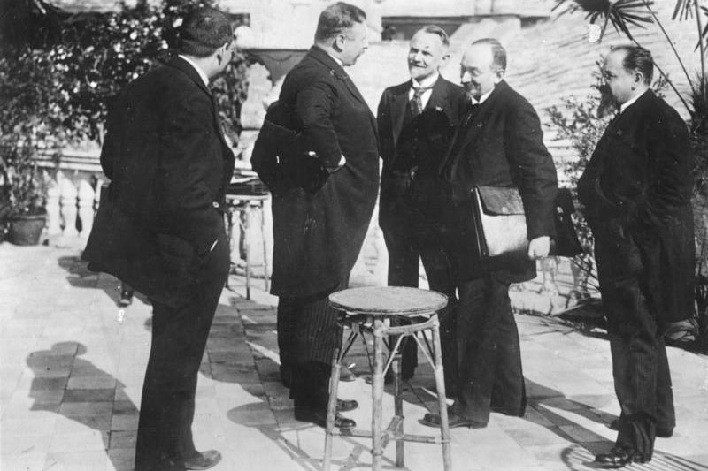 Podpisanie układu w Rapallo, kanclerz Rzeszy Joseph Wirth, Walther Rathenau oraz delegacja sowiecka: Leonid Krasin, Gieorgij Cziczerin oraz pochodzący z rodziny żydowskich Karaimów, Adolf Joffe. Foto: Bernhard Hossner/Bundesarchiv/Wikimedia Commons/CC