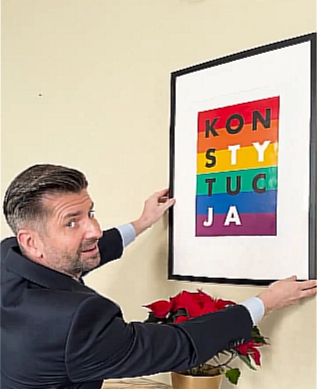 Zdjęcie po prawej: nowa obsada Ministerstwa sprawiedliwości, Śmiszek, w randze sekretarza stanu wiesza w urzędzie państwowym jeden z symboli Sodomy – “tęczowy” obrazek z pustym hasłem “Konstytucja”.