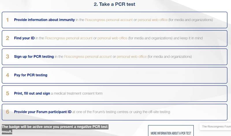 Zgodnie z tradycją bez negatywnego wyniku testu PCR nie zostaną państwo wpuszczeni na teren wydarzenia. SPIEF opublikował pomocny film, jeśli masz pytania dotyczące statusu wirusa: