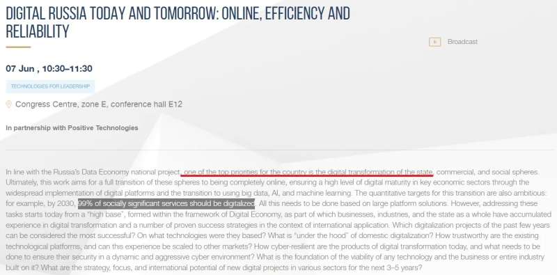 Podczas SPIEF’24 szczególna uwaga zostanie poświęcona „cyfrowej transformacji” Rosji. W końcu odpowiednie zainteresowane strony będą musiały współpracować, jeśli mają nadzieję na cyfryzację prawie wszystkich „istotnych społecznie” usług do 2030r.: