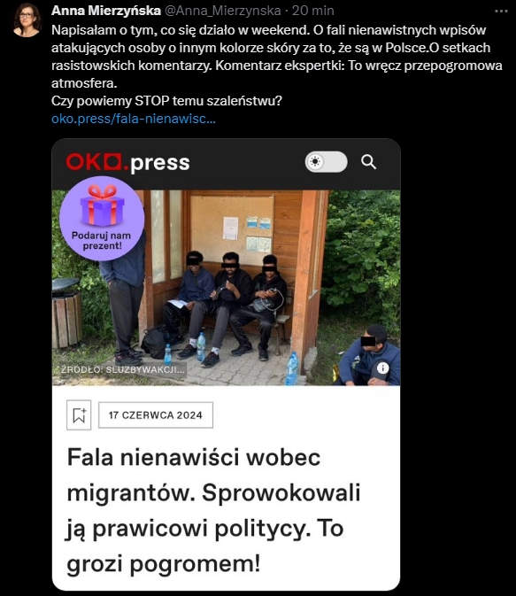 “Dzisiaj na X (dawniej Twitter) lewary oraz inne liberałki miotają w amoku epitetem “rasistowski” i z moralną wyższością kierują wyzwiska typu “rasista” pod adresem każdego, kto nie ma ochoty oglądać subsaharyjskich Murzynów i afgańskich pakoli u siebie na osiedlowym przystanku. Jest to idealna okazja, aby przypomnieć skalę lewarskiej hipokryzji w rzeczonym temacie. Otóż biali o poglądach lewicowych uciekają od “kolorowych imigrantów” do białych dzielnic i robią to częściej niż biali o poglądach konserwatywno-prawicowych. Innymi słowy, lewoskrętni na sztandarach mają wypisane obłąkańcze slogany, że “różnorodność jest naszą siłą”, po czym pakują walizki i bunkrują się w białych, izolowanych, homogenicznych rasowo enklawach. Niestety – nie wszystkich białych stać na luksus przeprowadzki. Ci mniej zamożni muszą żyć w towarzystwie Murzynów albo innych arabskich plemion i regularnie doświadczać dobrodziejstw ideologii multikulti, czyli konfliktów plemiennych, wybuchów bomb i granatów, syfu na ulicach, pospolitej przemocy oraz drastycznego spadku zaufania społecznego. Do refleksji“.