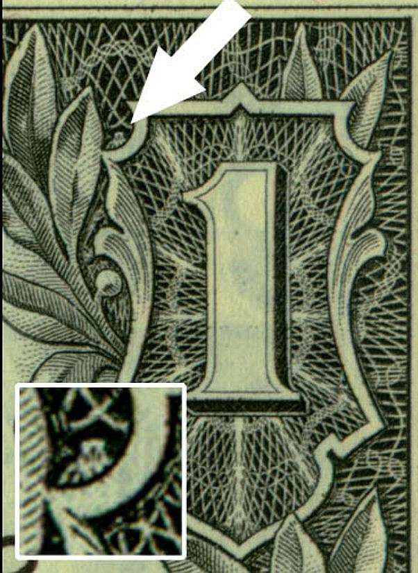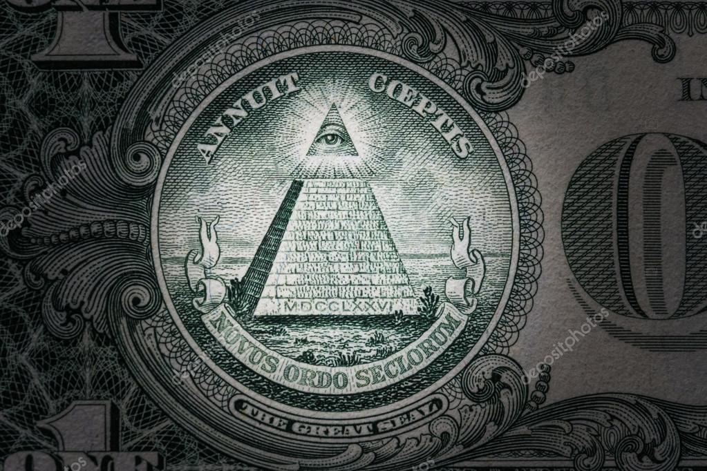 Zwraca uwagę fakt, że piramida na banknocie nie jest kompletna: brak jej szczytu, co wskazuje, iż cele Iluminatów jeszcze nie zostały osiągnięte. Nad brakującym szczytem unosi się Wszystkowidzące Oko – symbol ukradziony chrześcijaństwu, gdzie mamy Oko Opatrzności czyli Oko Boga w Trójcy Jedynego. U nich jednak symbolizuje ono Wielkiego Architekta Świata, który obserwuje każdego z nas, wszystko, co robimy i jako szczyt piramidy baczy na to, co umacnia jego panowanie (działalność tajnych stowarzyszeń) z