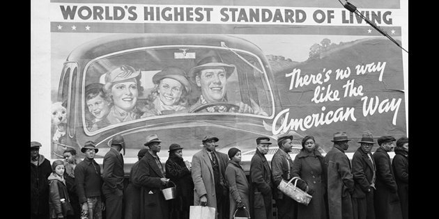 Czasy Wielkiego Kryzysu w USA: zdjęcie kolejki bezrobotnych na tle bilbordu zachwalającego American Way of Life (dla wybranych)
