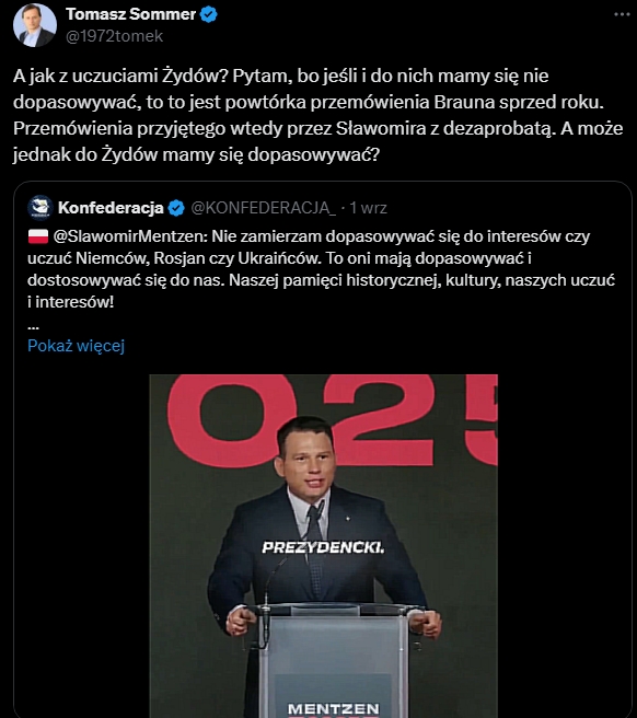 Mentzen wypowiedział te słowa podczas przemówienia otwierającego swoją kampanię. Tomasz Sommer wykorzystał je uzupełniając tym cytatem swoje pytanie na Twitterze/X