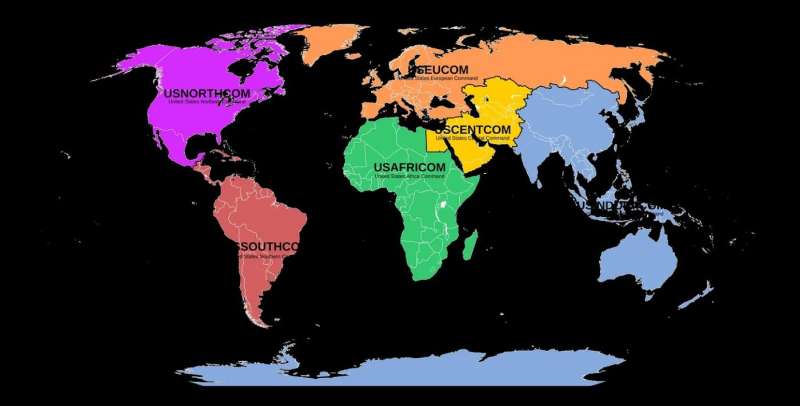 Podobnie jak w przypadku mapy Huntingtona, armia Stanów Zjednoczonych podzieliła świat na 6 stref lub „obszarów odpowiedzialności”. Służy to do zdefiniowania obszaru o określonych granicach geograficznych, na którym armia USA ma prawo planować i prowadzić operacje.