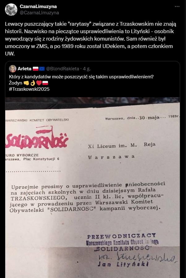 Z jakiej historii i tradycji jest dumny Trzaskowski? Które historyczne rocznice są dla niego ważne? Przypominam, że już w 1989 roku pracował jako wolontariusz dla byłych komunistów pochodzenia żydowskiego: Benjamina Lewertowa (Geremka) i Jana Lityńskiego.