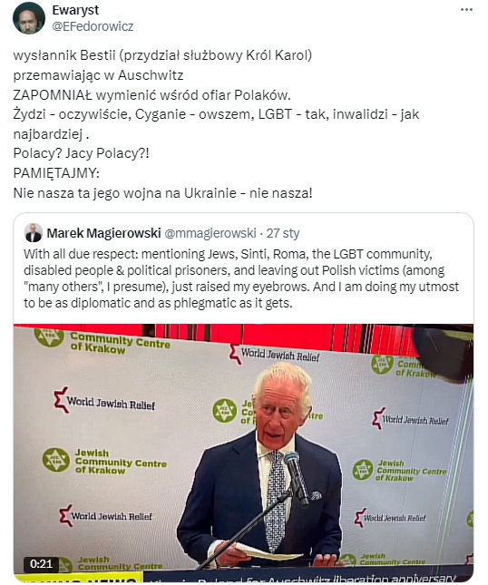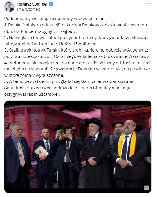 Uroczystość 80. rocznicy wyzwolenia niemieckiego obozu zagłady w Auschwitz zgromadziła ocalałych więźniów, ale także stworzyła okazję do powielania pewnego typu narracji, która wyklucza z historii Polaków jako ofiary i bohaterów, a w gronie sprawców dokonuje retuszu rozmazując wizerunki Niemców i Ukraińców. Jedynym prawdziwym elementem są żydowskie ofiary, które uległy zagładzie, nie mające w większości planów wyjazdu i osiedlenia się w przyszłym żydowskim państwie położonym w Palestynie, czyli żydzi, których nie przekonała lub do których nie dotarła syjonistyczna propaganda. Tutaj stawiam kropkę zostawiając resztę historykom.