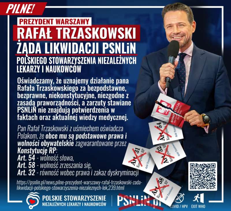 PILNE! Prezydent Warszawy Rafał Trzaskowski żąda likwidacji Polskiego Stowarzyszenia Niezależnych Lekarzy i Naukowców PSNLiN!