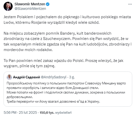 Na wizytę Mentzena zareagował znany z kultu ukraińskiego zbrodniarza aktualny mer Lwowa, Sadowy.