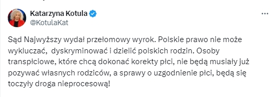 – napisała na platformie X Katarzyna Kotula była doktorantka, była magister, a według aktualnego opisu: „Ministra ds. Równości ; Posłanka IX i X kadencji Sejmu RP – Lewica, feministka, pasjonatka neuronauk, frakcja konserwatywno- pro militarna”.