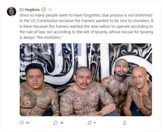 A teraz… no cóż, oto jesteśmy tutaj. Tak, zgadliście, czas znów porządnie naruszyć Konstytucję Stanów Zjednoczonych i wolność słowa, i deportować ludzi do jakiegoś salwadorskiego piekła, które wynajęliśmy, bo jakiemuś gliniarzowi nie podobały się ich tatuaże, oraz aresztować i wydawać studentów uniwersytetu za organizowanie antyizraelskich protestów, i oczywiście bombardować masy kłamstwami i oficjalną propagandą, i tak dalej, bo… OK, wszyscy razem: „inaczej antysemiccy terroryści i wenezuelscy członkowie gangów wygrają!”