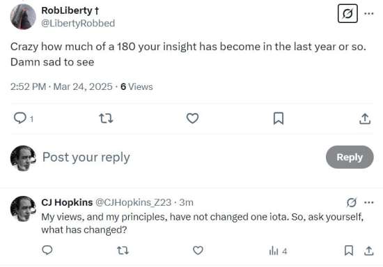 Och, i jeszcze jedno… jeśli jesteś jednym z moich byłych fanów, jak Rob, który jest zdezorientowany moimi „spostrzeżeniami”, lojalnościami czy czymkolwiek innym… cóż, artykuł, który właśnie przeczytałeś, powinien ci to wyjaśnić. Nie jestem po żadnej stronie. Po jakiejkolwiek stronie. Ale za to hołduję kilku podstawowym zasadom demokratycznym. Nie zmieniają się one w zależności od tego, co jest aktualnie popularne lub kto zajmuje Biały Dom.