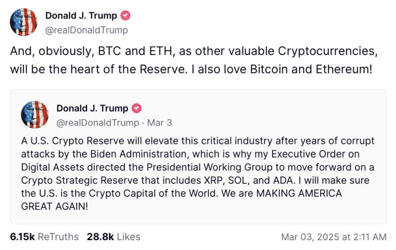 Donald Trump 3 marca zamieścił na swojej platformie społecznościowej Truth Social wpis o „kryptorezerwie” .