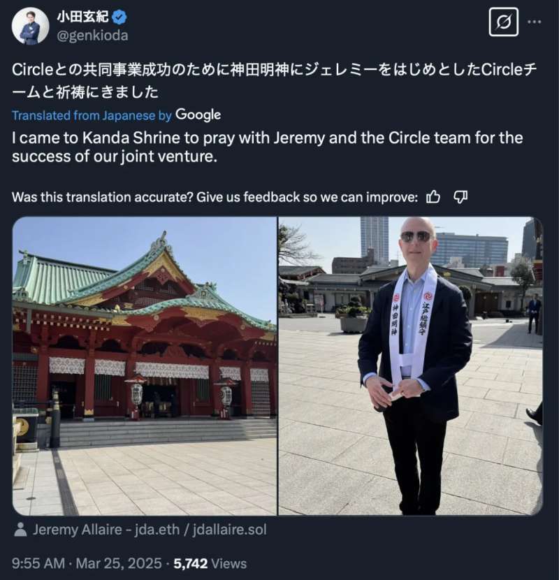 Rano 25 marca Genki Oda, przedstawiciel Japan Virtual and Crypto Assets Exchange Association (JVCEA) i ważna osobistość w SBI, opublikował na platformie społecznościowej Muska, X, zdjęcie zrobione w Kanda Shrine w Tokio. „Przyszedłem do Kanda Shrine, aby modlić się z Jeremym i zespołem Circle o sukces naszego wspólnego przedsięwzięcia” — zauważył (tłumaczone) w podpisie. Jeremy, o którym mówi, to Jeremy Allaire z Circle. Nowe przedsięwzięcie odnosi się do zatwierdzenia stablecoina USDC przez japoński rząd i oficjalnego wdrożenia na platformie SBI VC Trade.