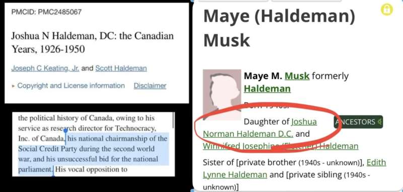 Elon Musk ze strony matki jest wnukiem Joshuy N. Haldemana, byłego polityka Kanadyjskiej Partii Kredytu Społecznego i technokraty.