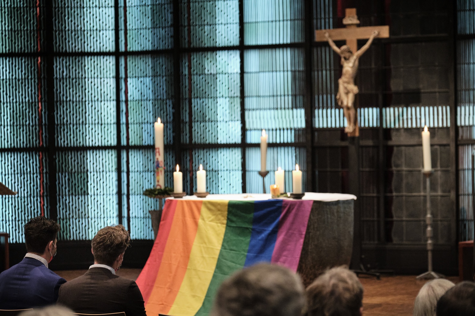 Para homoseksualistów w oczekiwaniu na “błogosławieństwo” przed ołtarzem przybranym flagą LGBT (Niemcy)