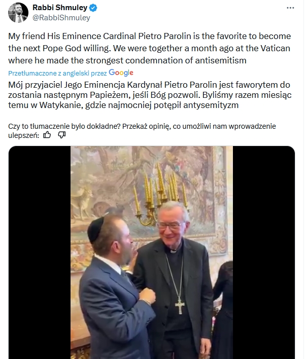 Jeśli dobrze zrozumiałam, to ta wypowiedź rabina Shmuleya na filmie była nagrana jeszcze za życia Franciszka. Zapewnia on kardynała Parolina, że: “wszystkie dzieci Ojca Świętego żydowskie na całym świecie modlą się o jego szybki powrót do zdrowia i że mają głębokie uczucie do niego za zwalczanie antysemityzmu”. Z filmu wynika, że spotkanie z Parolinem odbyło się na prośbę rabina.