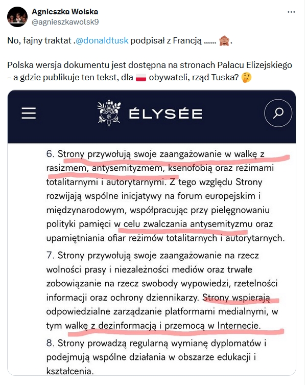 Trudno jednak wzmocnić coś co nie istnieje i ma taką samą wartość jak propagandowy bełkot o przyjaźni z Niemcami, Ukrainą i Wielką Brytanią. W zapisach umowy jest podobno wzmianka o „wspólnej obecności Polski i Francji w przestrzeni kosmicznej”. Jak na razie możemy jedynie mówić o wspólnej zagrodzie na wyspie Utopia coraz częściej nazywanej Eurokołchozem, w którym mieszkają, intensywnie się rozwijając: równi i równiejsi. W traktacie jest ponoć także zapis o pomocy militarnej dla Polski w czasie wojny. Wtórni analfabeci się cieszą, znający historię łapią się za głowę, tym bardziej, że amunicja dla Polski ma być produkowana… w Niemczech.