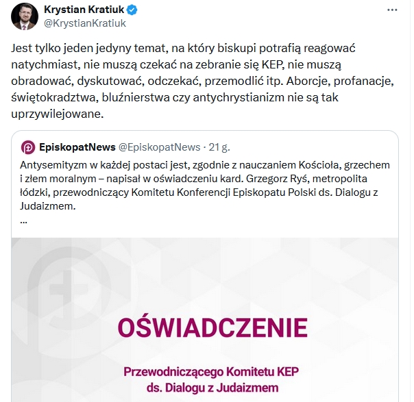 Ale te problemy jakoś nie wzbudzają zainteresowania abp. Rysia ani dziadunia z Żoliborza, który zostawił kota i chyżo podreptał zapisać się na tej kolejnej obowiązkowej liście obecności “oburzonych antysemityzmem” i potępiających Brauna. Rzeczywiście, tylko modlić się i zapłakać.