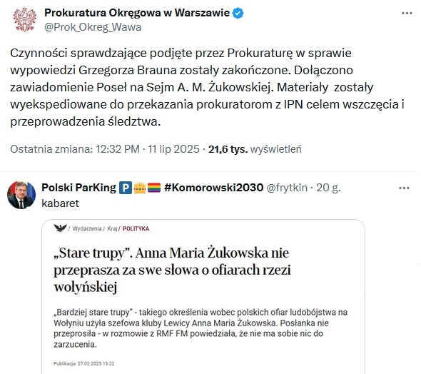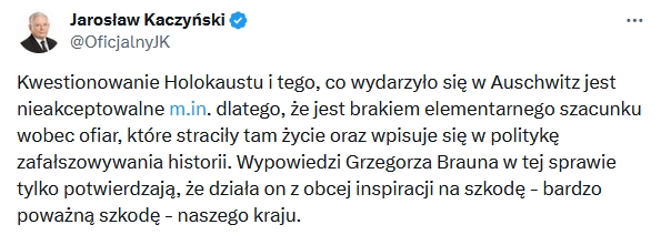 Pan Kaczyński dał głos-i dopatrzył się “negowania” tam gdzie go nie było-bo wypowiedź Brauna jest jak nożem ucięta. Przez redaktora który “dobrze powinność swoją rozumiał”-i pewnie nie miał zamiaru podzielić losu św.p. Dariusza Ratajczaka, jako napiętnowany “współsprawca”. Ten medialny klangor doskonale obrazuje czym jest “Polska”-kolonią myckowych, z całą praktycznie “elitą” złożoną z szabesgojów którzy się z kolan nie podnoszą. Kaczyński się oburza na niedokończoną wypowiedź (w której “antysemickiego mięsa” jest jakoś mało) ale wcale się nie oburza na osobnika (przypadkiem żydowskiego pochodzenia…) którego uczynił (?) premierem. Morawiecki usilnie pracował nad zapędzeniem nas do globalistycznego gułagu, z niemałym powodzeniem, do tego firmował swoją twarzą jakieś 200 tysięcy zgonów z wiadomych powodów. W ogólności ta dzika nagonka na Brauna skłania kogokolwiek komu na Polsce zależy-do autentycznej wściekłości na to sterowalne i głupie stado, które nie zadaje pytań tylko przyjmuje bez oporu “żydowskie prawdy wiary” jak własne. Niewątpliwie żydów (chazarów?) w II wojnie mordowano, ilu, to już kwestia dyskusji i badań historycznych, a dyskusja jest zamknięta bo rabini ustalili raz a porządnie co i jak-więc “causa finita” i teraz goje ani mru mru bo zostaniecie medialnie (przez jarmułkowe media) zlinczowani. Nie wiem czego potrzeba by goje w masie się obudzili-barbarzyńska masakra w Gazie to jak widać mało, liczy się holokaustowa metafizyka z której “naród prawniczy” wycisnął mamonę do ostatnich soków. Żmijowe plemię trzyma w uścisku cały Zachód i Bóg wie, co jeszcze. Żydzi mają w Polsce o wiele większe wpływy obecnie, chociaż formalnie “prawie ich nie ma”-niż przed wojną, gdy było ich miliony. Upadliśmy straszliwie.